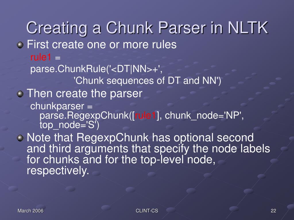 Chunkparser with Unchunk Rule >>> chunk_rule = parse.ChunkRule('<NN|DT|JJ>+','Chunk sequences of NN, JJ, and DT') >>> chunkparser = parse.RegexpChunk([chunk_rule, unchunk_rule], chunk_node='NP', top_node='S') CLINT-CS