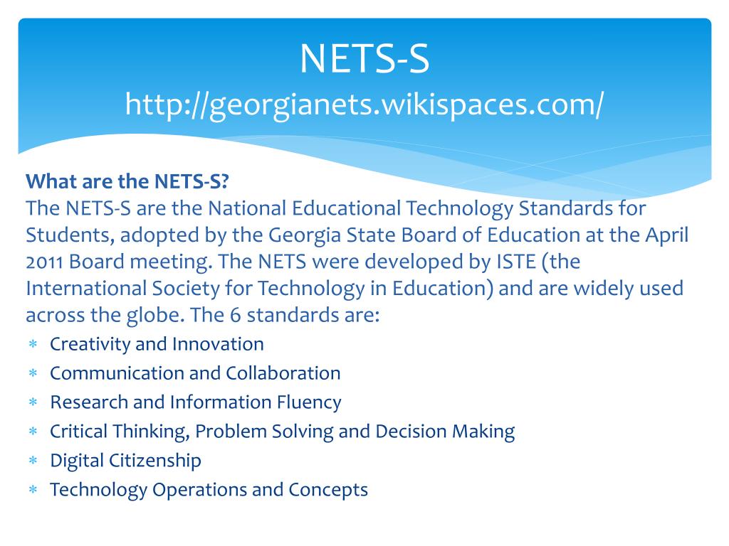 NETS-Shttp://georgianets.wikispaces.com/ What are the NETS-S?The NETS-S are the National Educational Technology Standards for Students, adopted by the Georgia State Board of Education at the April 2011 Board meeting. The NETS were developed by ISTE (the International Society for Technology in Education) and are widely used across the globe. The 6 standards are: Creativity and Innovation Communication and Collaboration Research and Information Fluency Critical Thinking, Problem Solving and Decision Making Digital Citizenship Technology Operations and Concepts