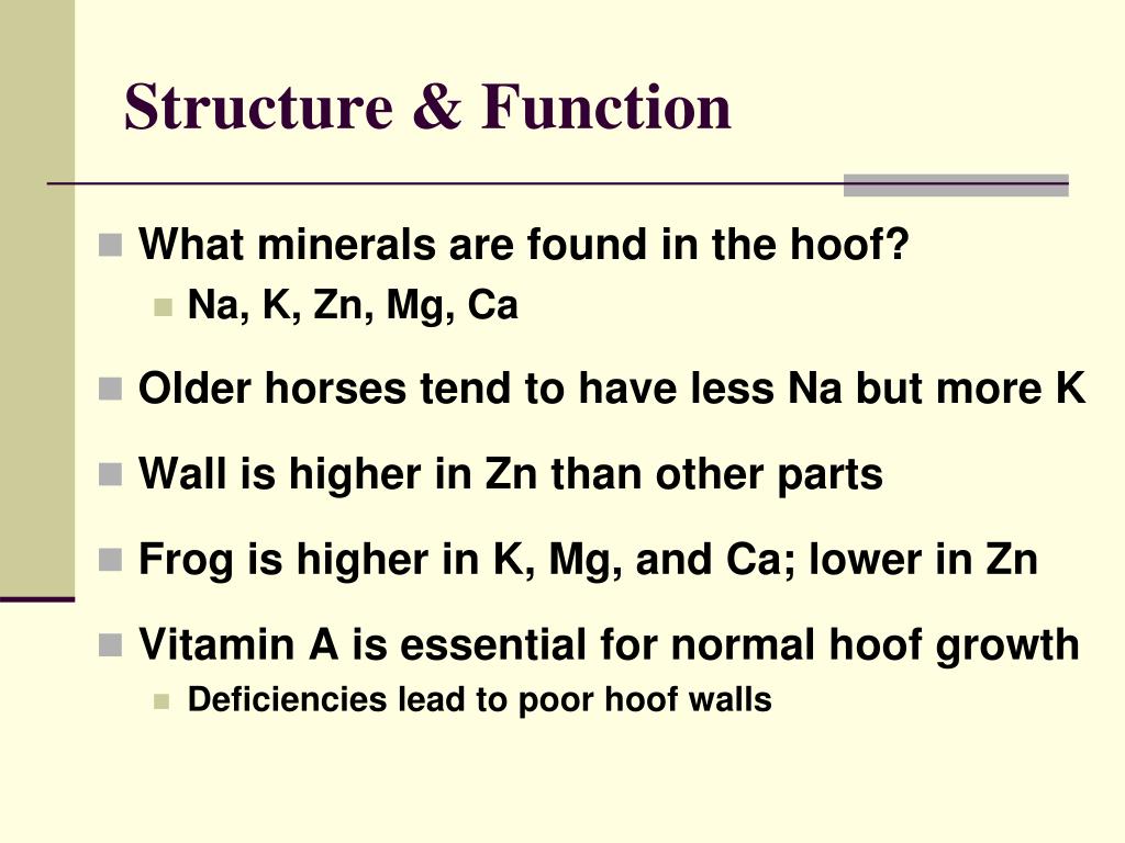 Structure & Function • What minerals are found in the hoof? • Na, K, Zn, Mg, Ca • Older horses tend to have less Na but more K • Wall is higher in Zn than other parts • Frog is higher in K, Mg, and Ca; lower in Zn • Vitamin A is essential for normal hoof growth • Deficiencies lead to poor hoof walls