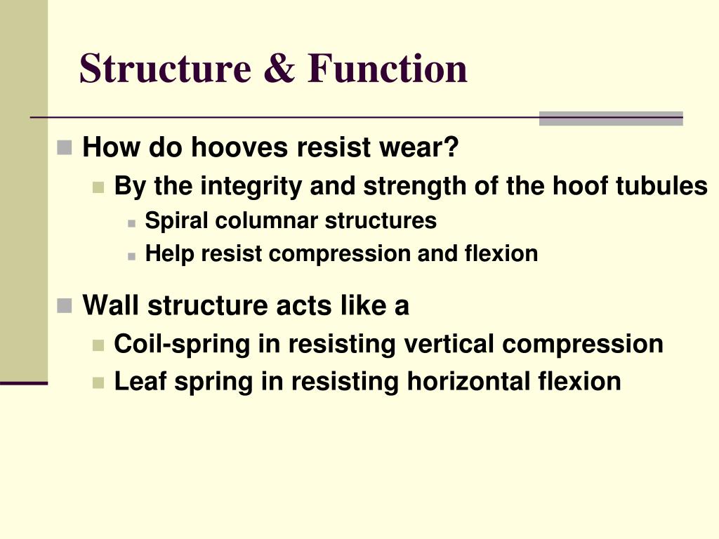 Structure & Function • How do hooves resist wear? • By the integrity and strength of the hoof tubules • Spiral columnar structures • Help resist compression and flexion • Wall structure acts like a • Coil-spring in resisting vertical compression • Leaf spring in resisting horizontal flexion