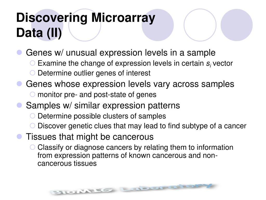 Discovering Microarray Data (I) • Genes w/ similar expression pattern over all samples • Compare eiand ej • Cluster analysis to group similar expression patterns • Define novel genes that are similar to known genes • Characterize cluster functions • Find genes which fit a prototypical pattern over samples