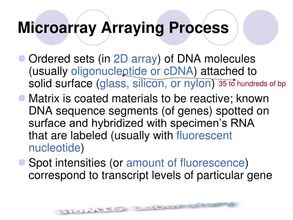 Microarray Arraying Process • Ordered sets (in 2D array) of DNA molecules (usually oligonucleotide or cDNA) attached to solid surface (glass, silicon, or nylon) • Matrix is coated materials to be reactive; known DNA sequence segments (of genes) spotted on surface and hybridized with specimen’s RNA that are labeled (usually with fluorescent nucleotide) • Spot intensities (or amount of fluorescence) correspond to transcript levels of particular gene 35 to hundreds of bp