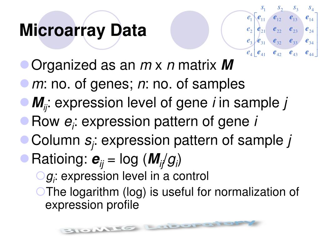 Microarray Data • Organized as an m x n matrix M • m: no. of genes; n: no. of samples • Mij: expression level of gene i in sample j • Row ei: expression pattern of gene i • Column sj: expression pattern of sample j • Ratioing: eij = log (Mij/gi) • gi: expression level in a control • The logarithm (log) is useful for normalization of expression profile