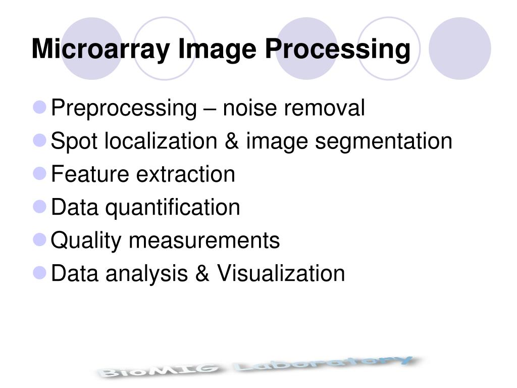 Microarray Image Processing • Preprocessing – noise removal • Spot localization & image segmentation • Feature extraction • Data quantification • Quality measurements • Data analysis & Visualization