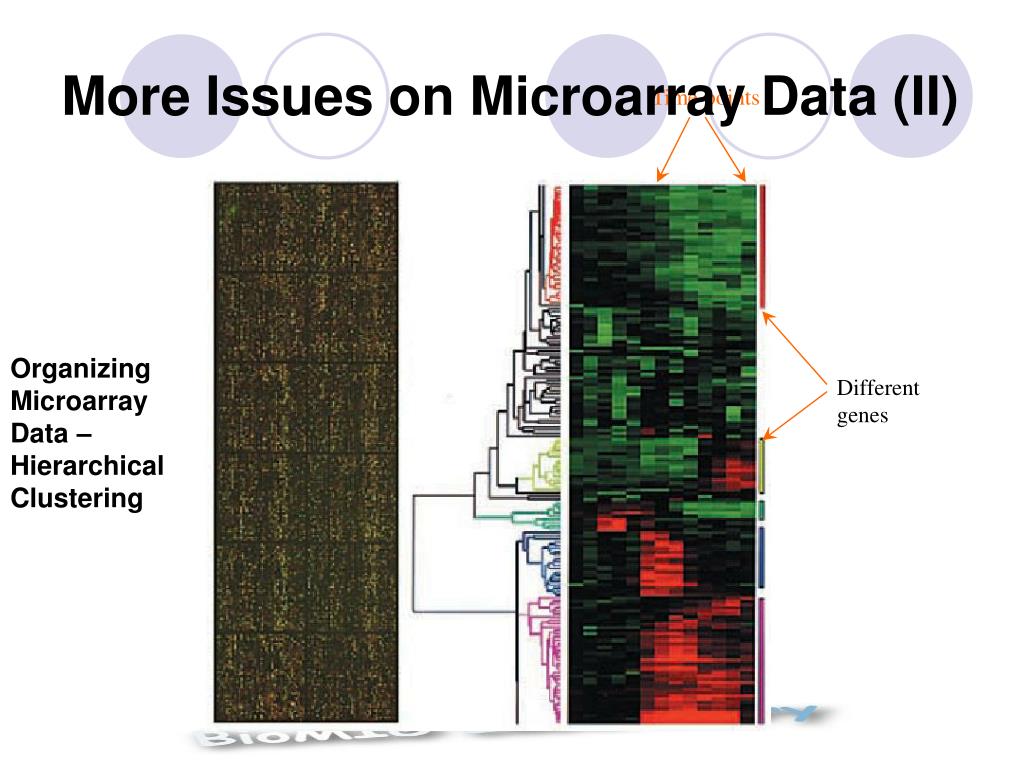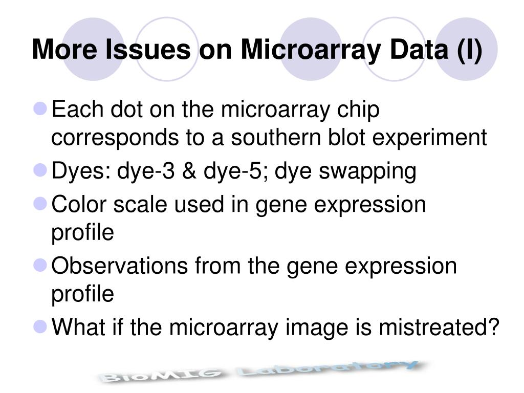 More Issues on Microarray Data (I) • Each dot on the microarray chip corresponds to a southern blot experiment • Dyes: dye-3 & dye-5; dye swapping • Color scale used in gene expression profile • Observations from the gene expression profile • What if the microarray image is mistreated?