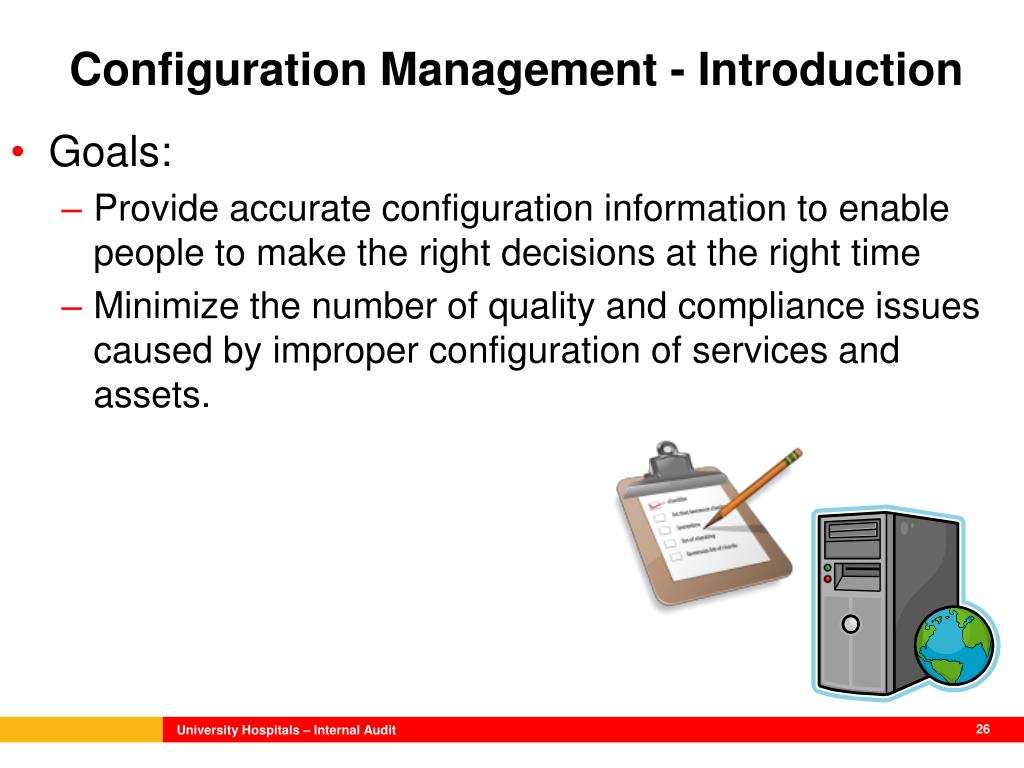 Configuration Management - Introduction • Goals: • Provide accurate configuration information to enable people to make the right decisions at the right time • Minimize the number of quality and compliance issues caused by improper configuration of services and assets.