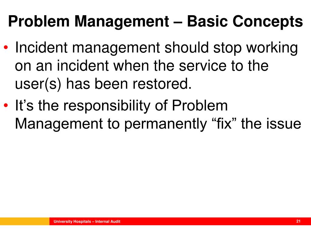 Problem Management – Basic Concepts • Incident management should stop working on an incident when the service to the user(s) has been restored. • It’s the responsibility of Problem Management to permanently “fix” the issue