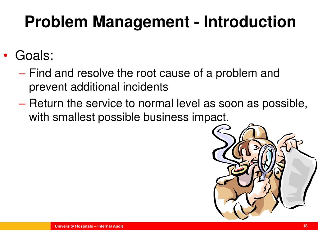 Problem Management - Introduction • Goals: • Find and resolve the root cause of a problem and prevent additional incidents • Return the service to normal level as soon as possible, with smallest possible business impact.