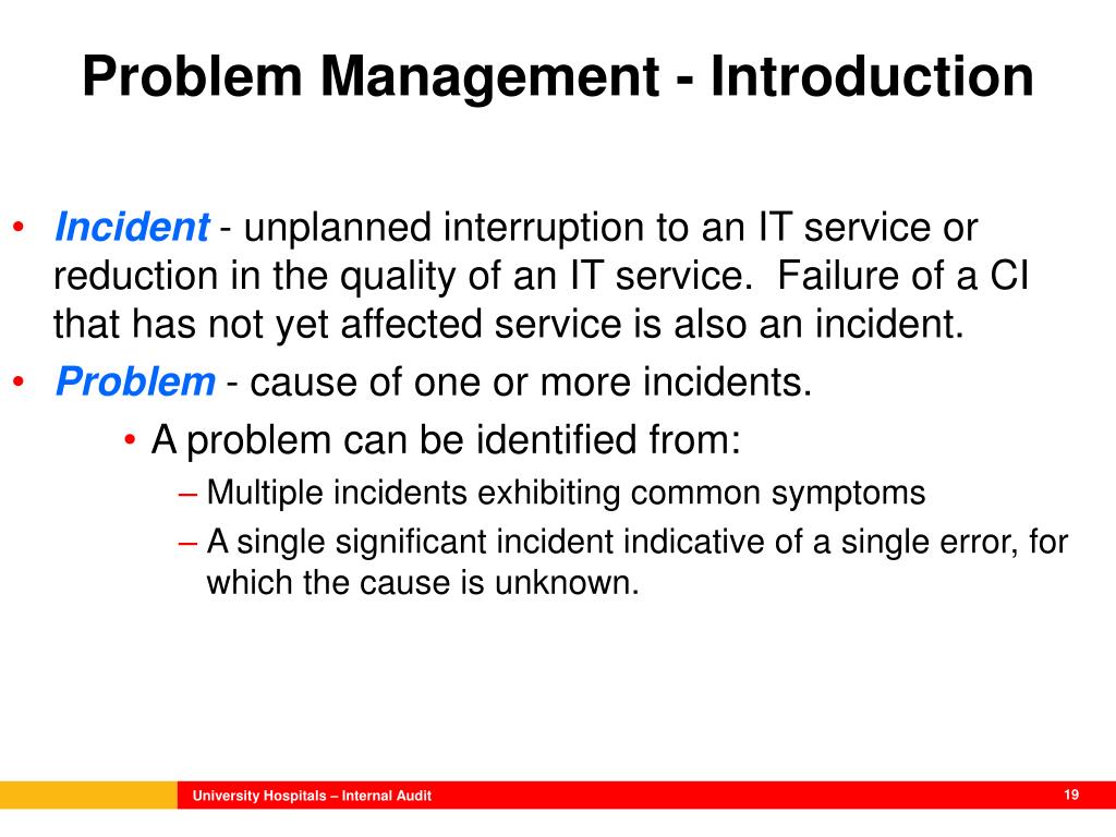Problem Management - Introduction • Incident - unplanned interruption to an IT service or reduction in the quality of an IT service. Failure of a CI that has not yet affected service is also an incident. • Problem - cause of one or more incidents. • A problem can be identified from: • Multiple incidents exhibiting common symptoms • A single significant incident indicative of a single error, for which the cause is unknown.