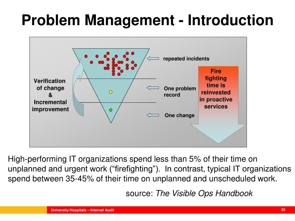 Problem Management - Introduction High-performing IT organizations spend less than 5% of their time on unplanned and urgent work (“firefighting”). In contrast, typical IT organizations spend between 35-45% of their time on unplanned and unscheduled work. source: The Visible Ops Handbook