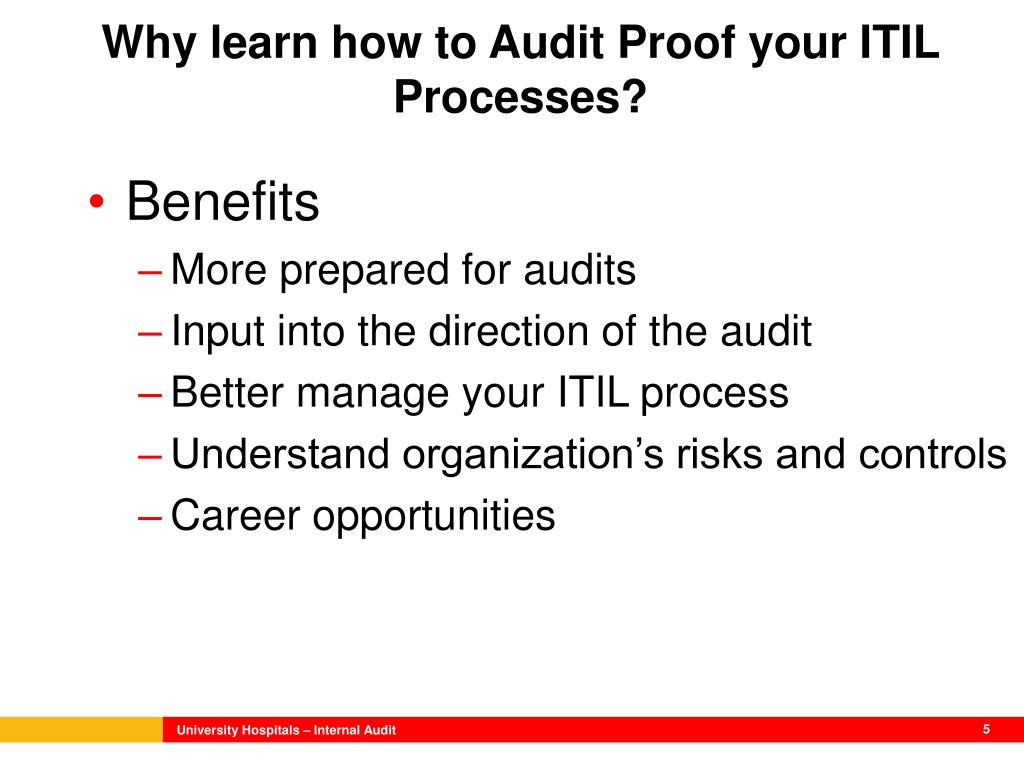 Why learn how to Audit Proof your ITIL Processes? • Benefits • More prepared for audits • Input into the direction of the audit • Better manage your ITIL process • Understand organization’s risks and controls • Career opportunities