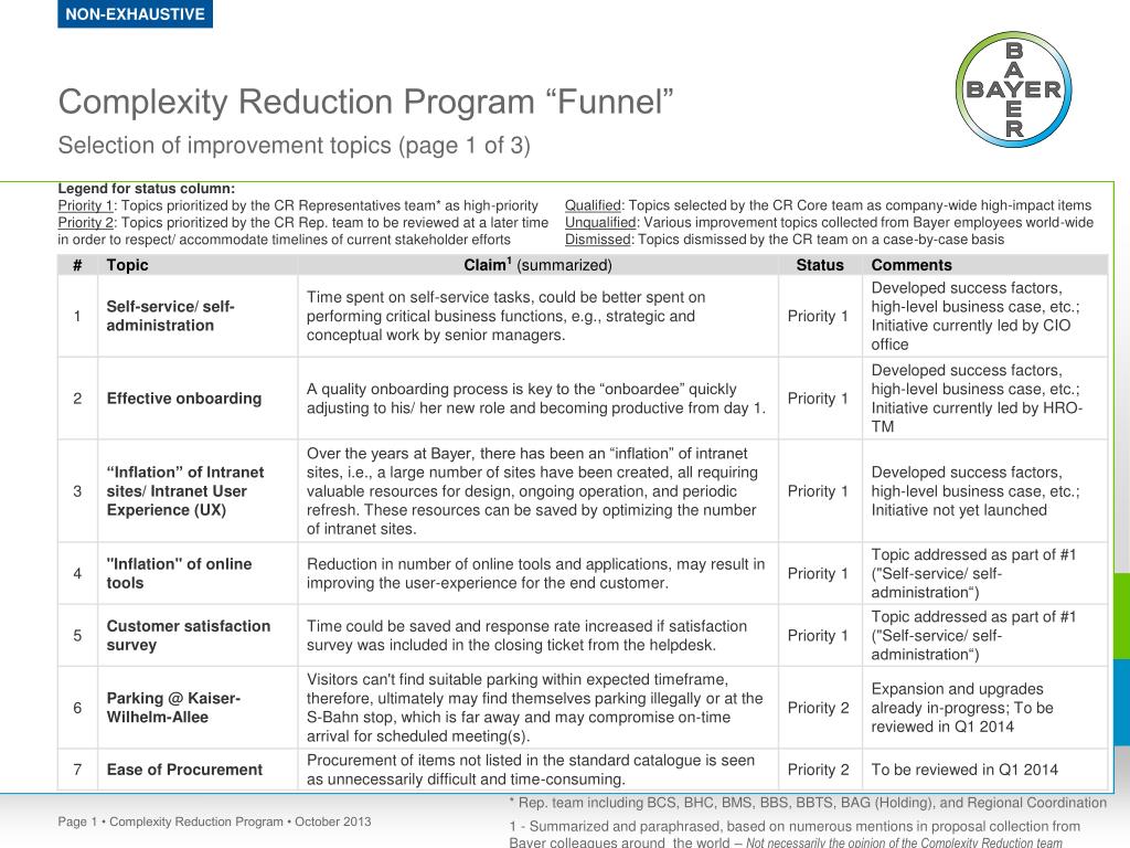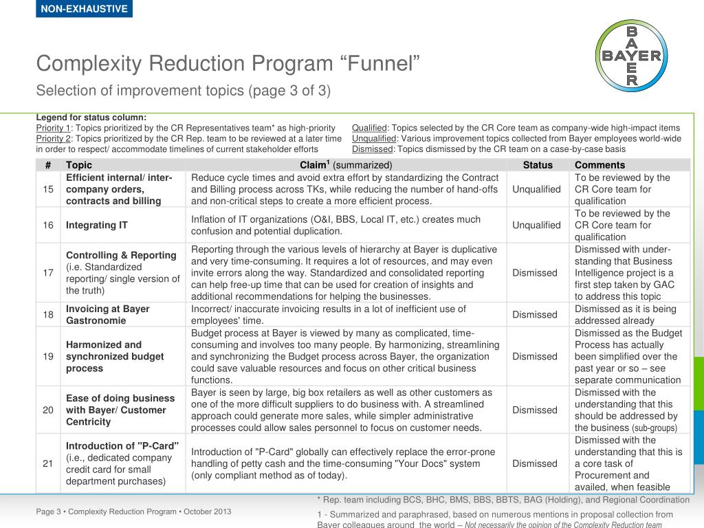 Complexity Reduction Program “Funnel” NON-EXHAUSTIVE Selection of improvement topics (page 1 of 3) Legend for status column: Priority 1: Topics prioritized by the CR Representatives team* as high-priority Priority 2: Topics prioritized by the CR Rep. team to be reviewed at a later time in order to respect/ accommodate timelines of current stakeholder efforts Qualified: Topics selected by the CR Core team as company-wide high-impact items Unqualified: Various improvement topics collected from Bayer employees world-wide Dismissed: Topics dismissed by the CR team on a case-by-case basis * Rep. team including BCS, BHC, BMS, BBS, BBTS, BAG (Holding), and Regional Coordination 1 - Summarized and paraphrased, based on numerous mentions in proposal collection from Bayer colleagues around the world – Not necessarily the opinion of the Complexity Reduction team