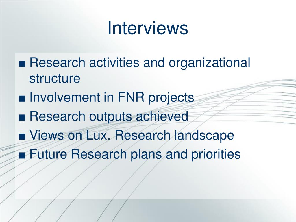 Interviews • Research activities and organizational structure • Involvement in FNR projects • Research outputs achieved • Views on Lux. Research landscape • Future Research plans and priorities