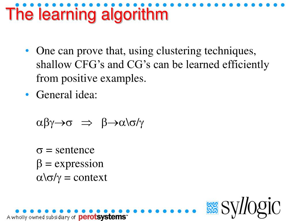 The learning algorithm • One can prove that, using clustering techniques, shallow CFG’s and CG’s can be learned efficiently from positive examples. • General idea: \/ = sentence = expression\/ = context