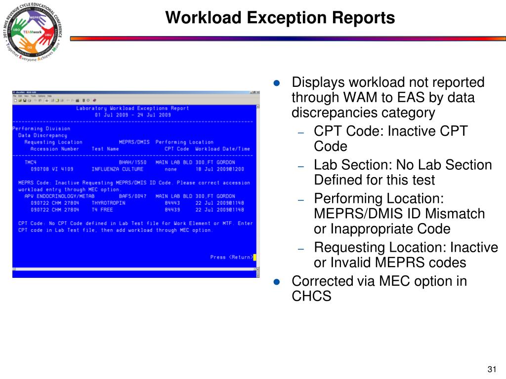 Displays workload not reported through WAM to EAS by data discrepancies category CPT Code: Inactive CPT Code Lab Section: No Lab Section Defined for this test Performing Location: MEPRS/DMIS ID Mismatch or Inappropriate Code Requesting Location: Inactive or Invalid MEPRS codes Corrected via MEC option in CHCS Workload Exception Reports