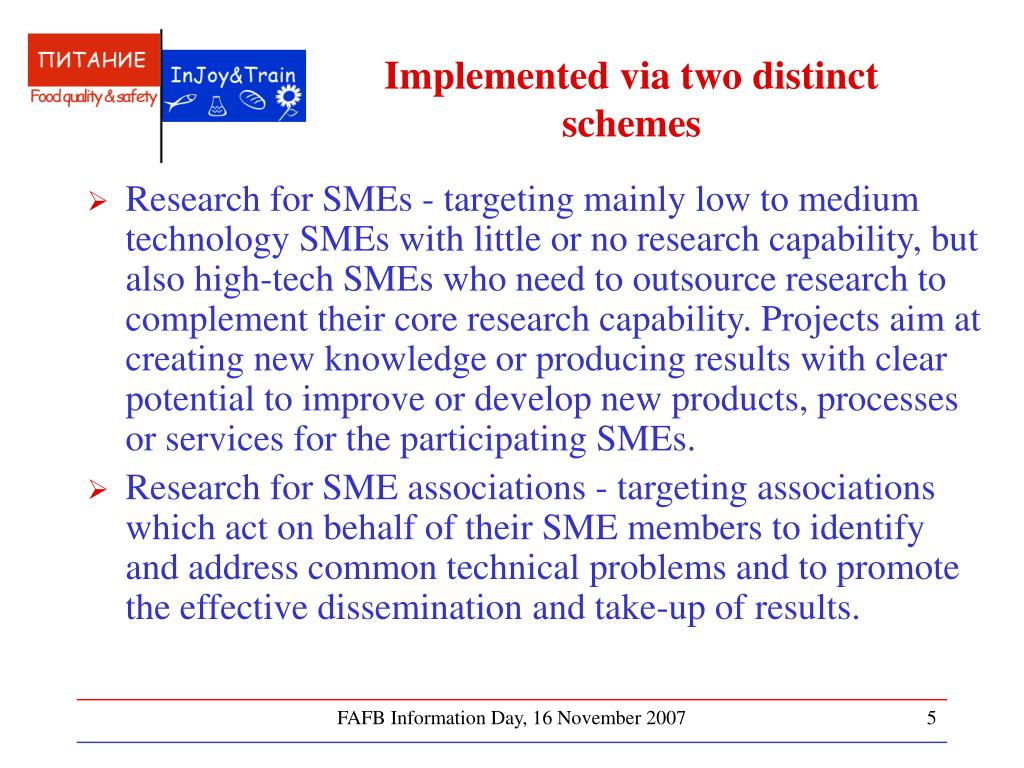 Implemented via two distinct schemes • Research for SMEs - targeting mainly low to medium technology SMEs with little or no research capability, but also high-tech SMEs who need to outsource research to complement their core research capability. Projects aim at creating new knowledge or producing results with clear potential to improve or develop new products, processes or services for the participating SMEs. • Research for SME associations - targeting associations which act on behalf of their SME members to identify and address common technical problems and to promote the effective dissemination and take-up of results. FAFB Information Day, 16 November 2007