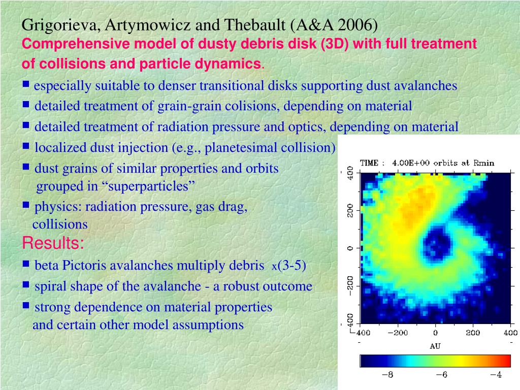 Grigorieva, Artymowicz and Thebault (A&A 2006) Comprehensive model of dusty debris disk (3D) with full treatment of collisions and particle dynamics. ■ especially suitable to denser transitional disks supporting dust avalanches ■ detailed treatment of grain-grain colisions, depending on material ■ detailed treatment of radiation pressure and optics, depending on material ■ localized dust injection (e.g., planetesimal collision) ■ dust grains of similar properties and orbits grouped in “superparticles” ■ physics: radiation pressure, gas drag, collisions Results: ■ beta Pictoris avalanches multiply debris x(3-5) ■ spiral shape of the avalanche - a robust outcome ■ strong dependence on material properties and certain other model assumptions