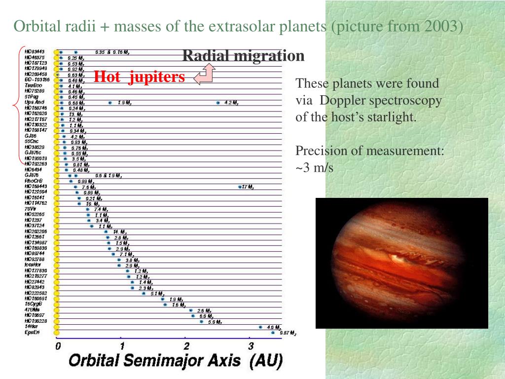 Orbital radii + masses of the extrasolar planets (picture from 2003) Radial migration Hot jupiters These planets were found via Doppler spectroscopy of the host’s starlight. Precision of measurement: ~3 m/s