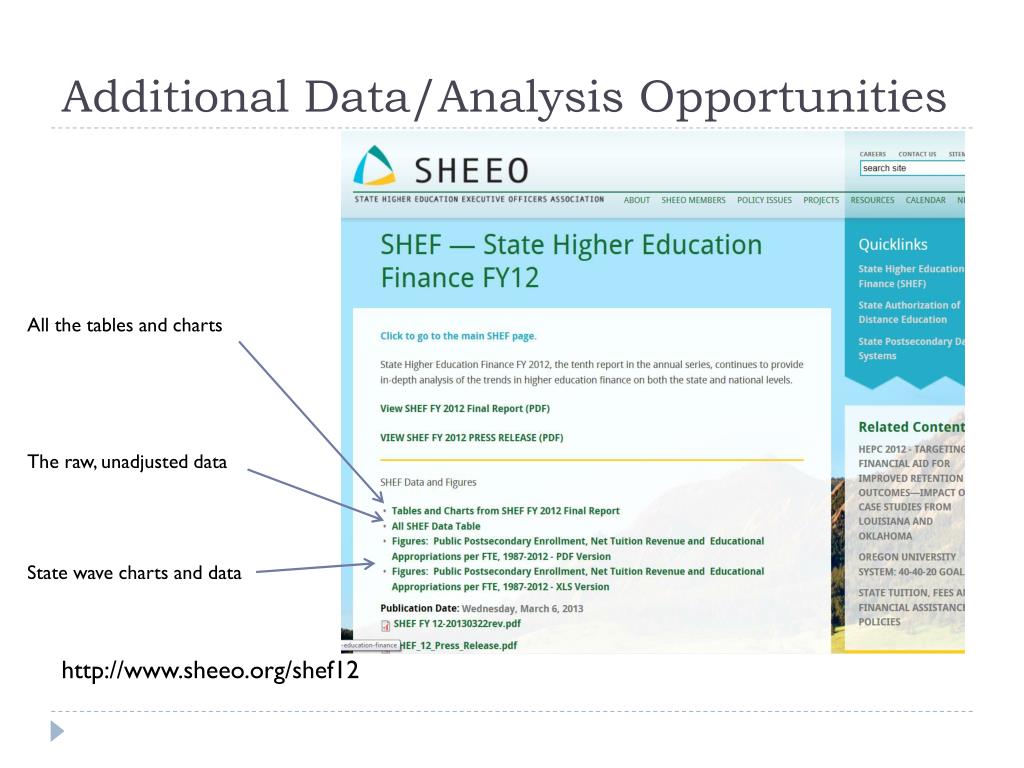 Additional Data/Analysis Opportunities All the tables and charts The raw, unadjusted data State wave charts and data http://www.sheeo.org/shef12
