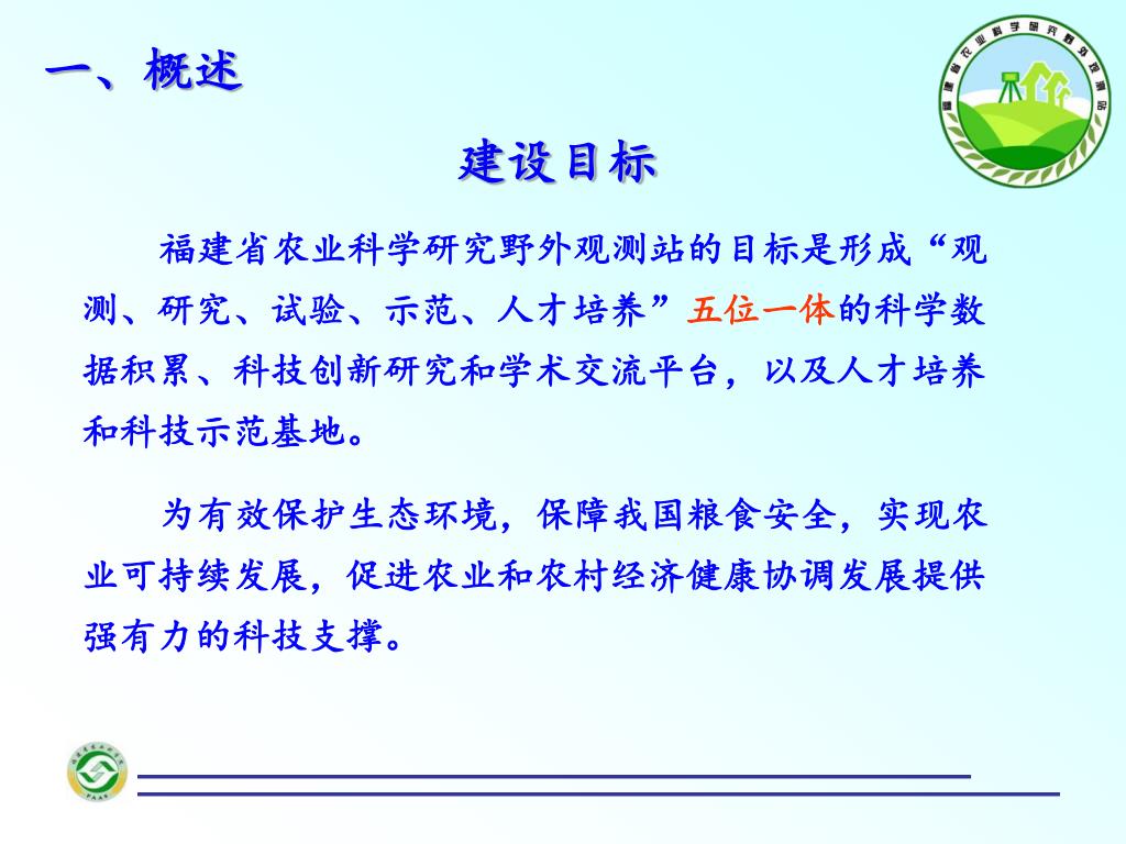 汇报大纲 ◆ 概述 ◆ 总站建设进展 ◆ 农业有害生物可持续控制武夷山试验站进展 ◆ 亚热带牧草资源泉州试验站进展 ◆ 农业生物资源宁德试验站进展 ◆ 水稻土土壤肥力与生态环境福州试验站进展 ◆ 农作物病虫害漳州试验站进展 ◆ 野外观测数据集