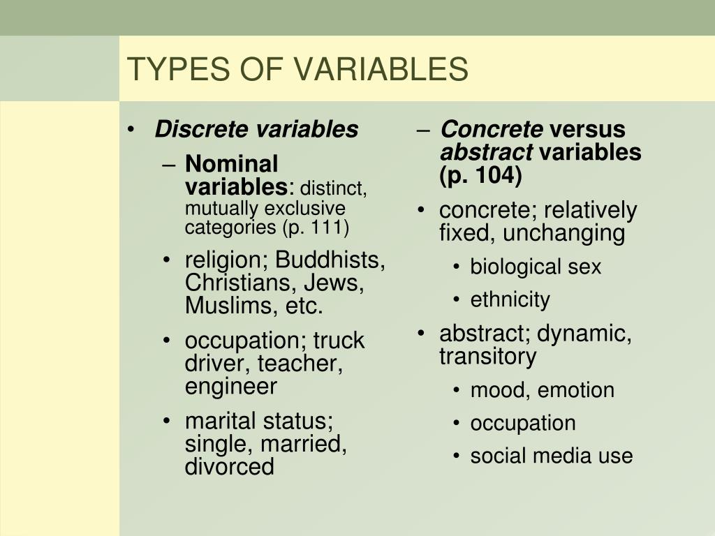 TYPES OF VARIABLES • Discrete variables • Nominal variables: distinct, mutually exclusive categories (p. 111) • religion; Buddhists, Christians, Jews, Muslims, etc. • occupation; truck driver, teacher, engineer • marital status; single, married, divorced • Concrete versus abstract variables (p. 104) • concrete; relatively fixed, unchanging • biological sex • ethnicity • abstract; dynamic, transitory • mood, emotion • occupation • social media use