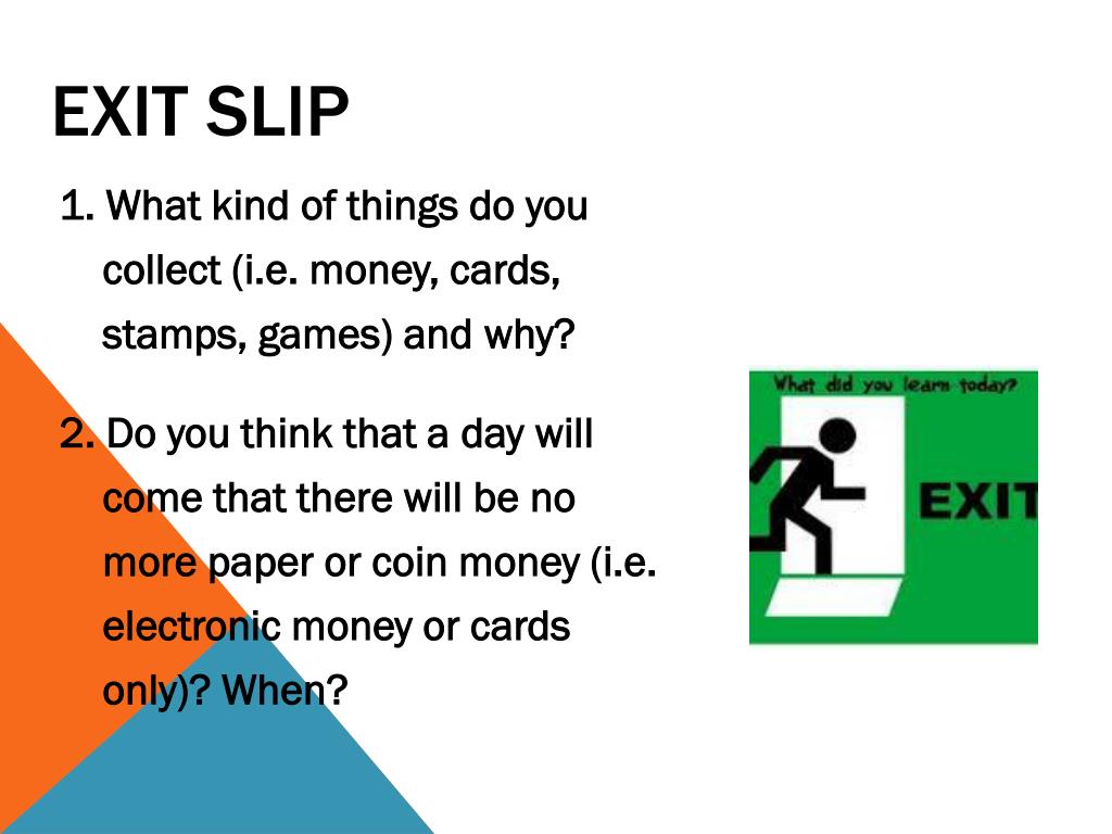 1. What kind of things do you collect (i.e. money, cards, stamps, games) and why? Exit Slip 2. Do you think that a day will come that there will be no more paper or coin money (i.e. electronic money or cards only)? When?