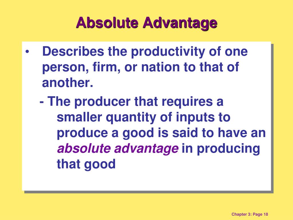 Absolute Advantage • Describes the productivity of one person, firm, or nation to that of another. - The producer that requires a smaller quantity of inputs to produce a good is said to have an absolute advantage in producing that good