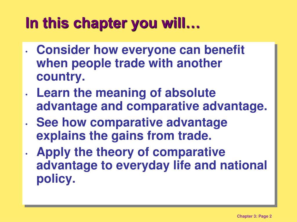 In this chapter you will… • Consider how everyone can benefit when people trade with another country. • Learn the meaning of absolute advantage and comparative advantage. • See how comparative advantage explains the gains from trade. • Apply the theory of comparative advantage to everyday life and national policy.