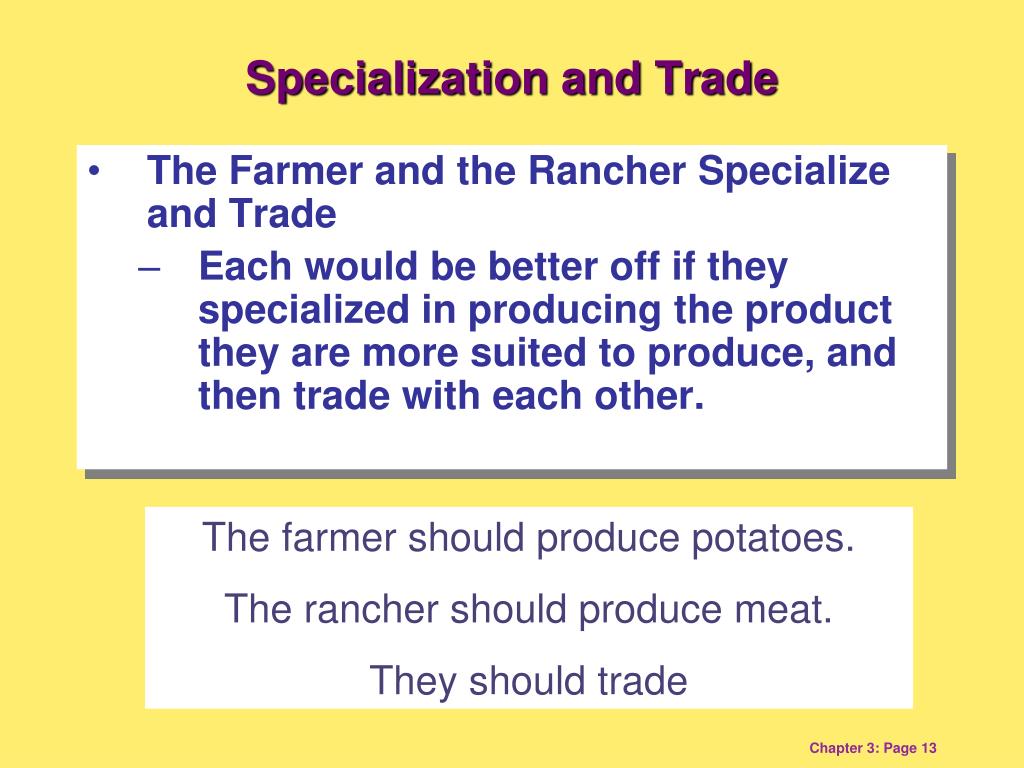 Specialization and Trade • The Farmer and the Rancher Specialize and Trade • Each would be better off if they specialized in producing the product they are more suited to produce, and then trade with each other. The farmer should produce potatoes. The rancher should produce meat. They should trade