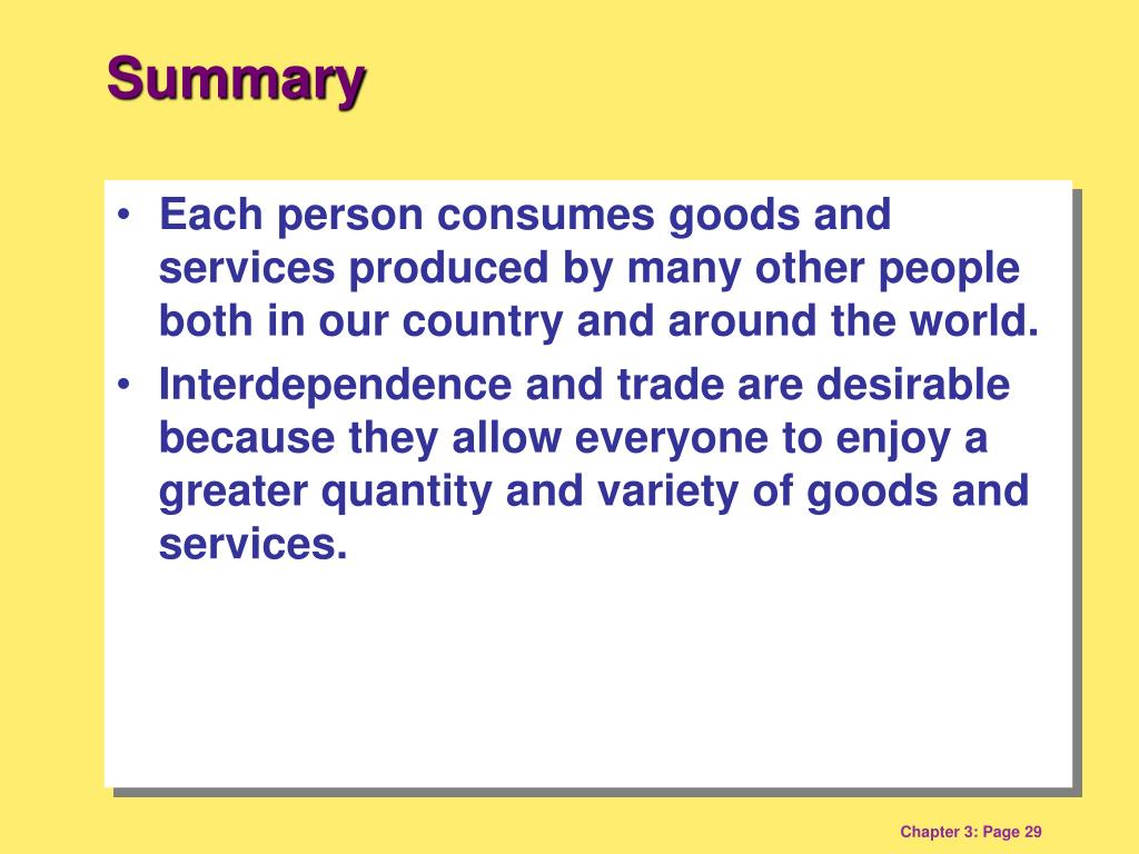 Summary • Each person consumes goods and services produced by many other people both in our country and around the world. • Interdependence and trade are desirable because they allow everyone to enjoy a greater quantity and variety of goods and services.