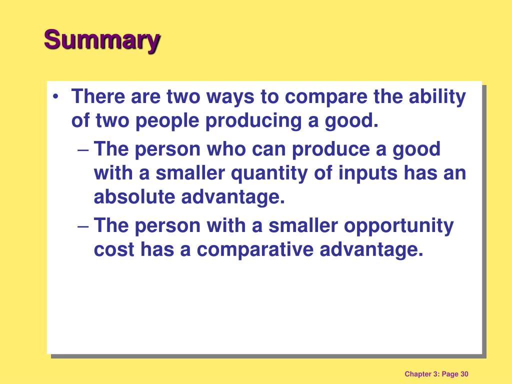 Summary • There are two ways to compare the ability of two people producing a good. • The person who can produce a good with a smaller quantity of inputs has an absolute advantage. • The person with a smaller opportunity cost has a comparative advantage.