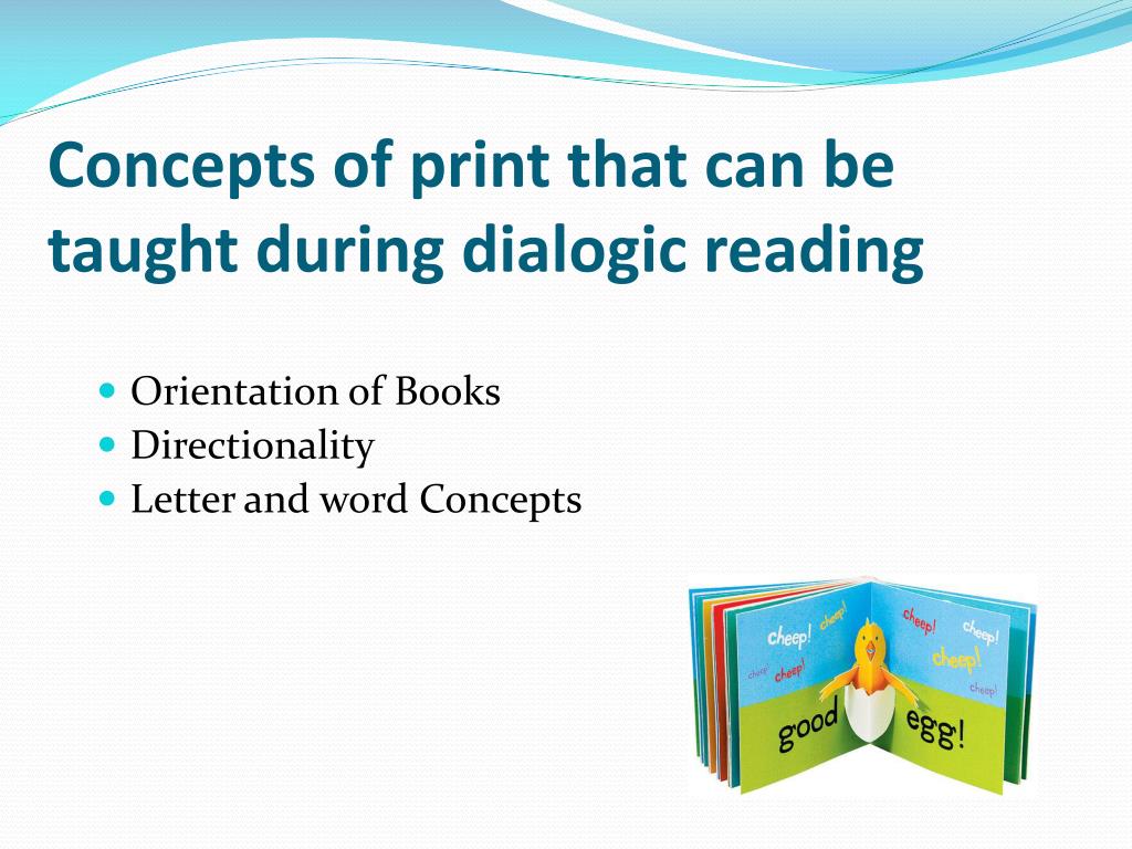 Concepts of print that can be taught during dialogic reading • Orientation of Books • Directionality • Letter and word Concepts