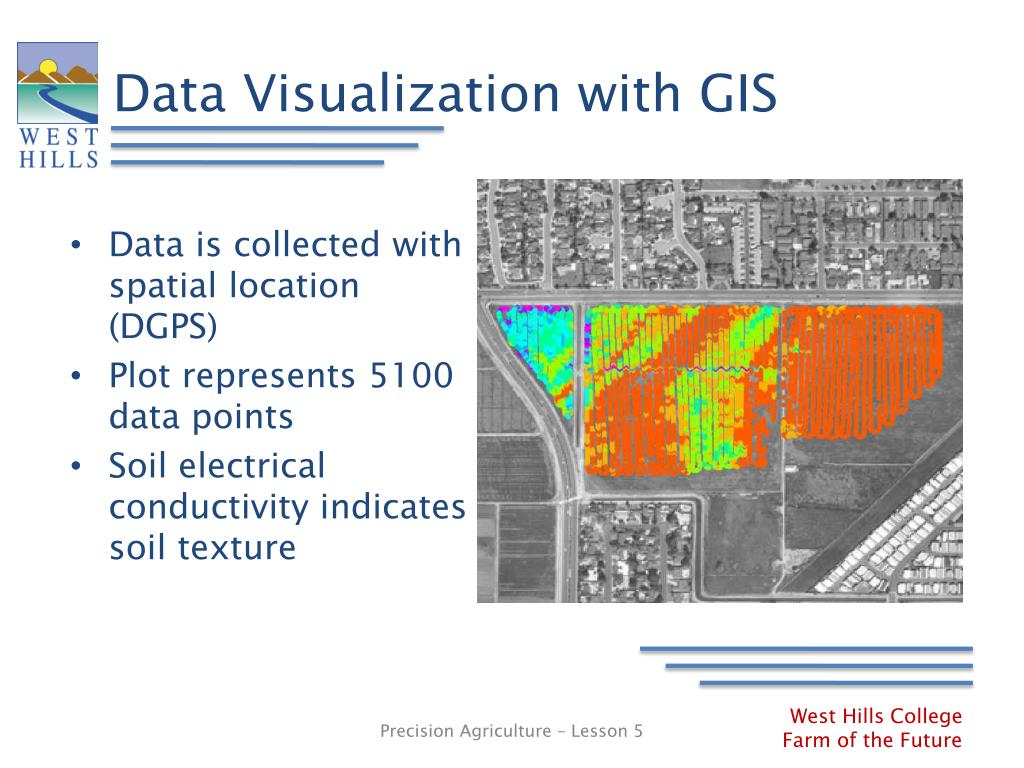 Data Visualization with GIS • Data is collected with spatial location (DGPS) • Plot represents 5100 data points • Soil electrical conductivity indicates soil texture Precision Agriculture – Lesson 5