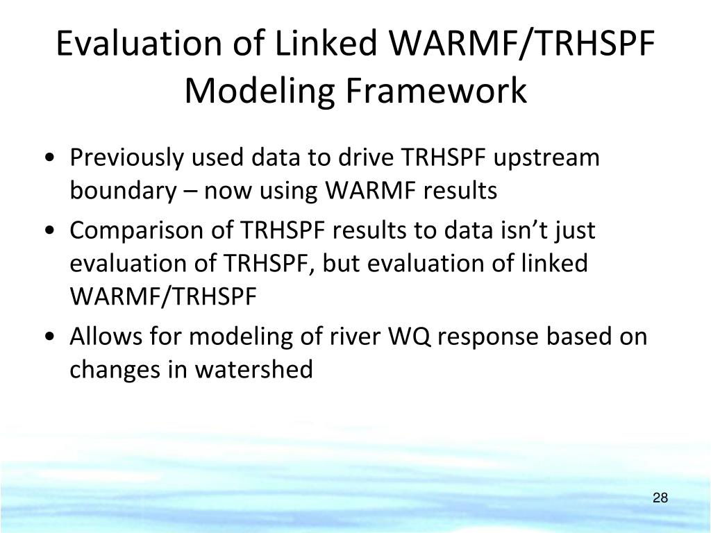 Evaluation of Linked WARMF/TRHSPF Modeling Framework • Previously used data to drive TRHSPF upstream boundary – now using WARMF results • Comparison of TRHSPF results to data isn’t just evaluation of TRHSPF, but evaluation of linked WARMF/TRHSPF • Allows for modeling of river WQ response based on changes in watershed