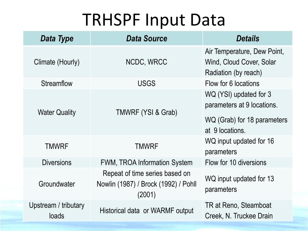 Selection of Flow Management Model • Flow management model will provide a mechanism to determine a representative low flow condition with current river operations and historical climate • TROM (Truckee River Operations Model) • Long history of application in Truckee River • Previously coupled with WARMF/TRHSPF for test simulation • RiverWare • Newer model; water accounting version functional • Still under development