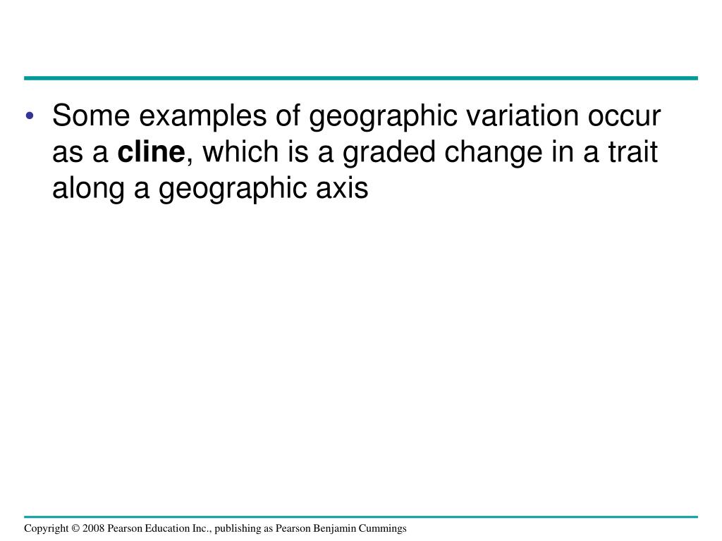 Some examples of geographic variation occur as a cline, which is a graded change in a trait along a geographic axis