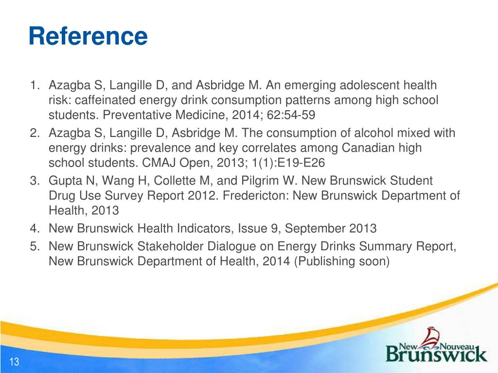 Reference • Azagba S, Langille D, and Asbridge M. An emerging adolescent health risk: caffeinated energy drink consumption patterns among high school students. Preventative Medicine, 2014; 62:54-59 • Azagba S, Langille D, Asbridge M. The consumption of alcohol mixed with energy drinks: prevalence and key correlates among Canadian high school students. CMAJ Open, 2013; 1(1):E19-E26 • Gupta N, Wang H, Collette M, and Pilgrim W. New Brunswick Student Drug Use Survey Report 2012. Fredericton: New Brunswick Department of Health, 2013 • New Brunswick Health Indicators, Issue 9, September 2013 • New Brunswick Stakeholder Dialogue on Energy Drinks Summary Report, New Brunswick Department of Health, 2014 (Publishing soon)