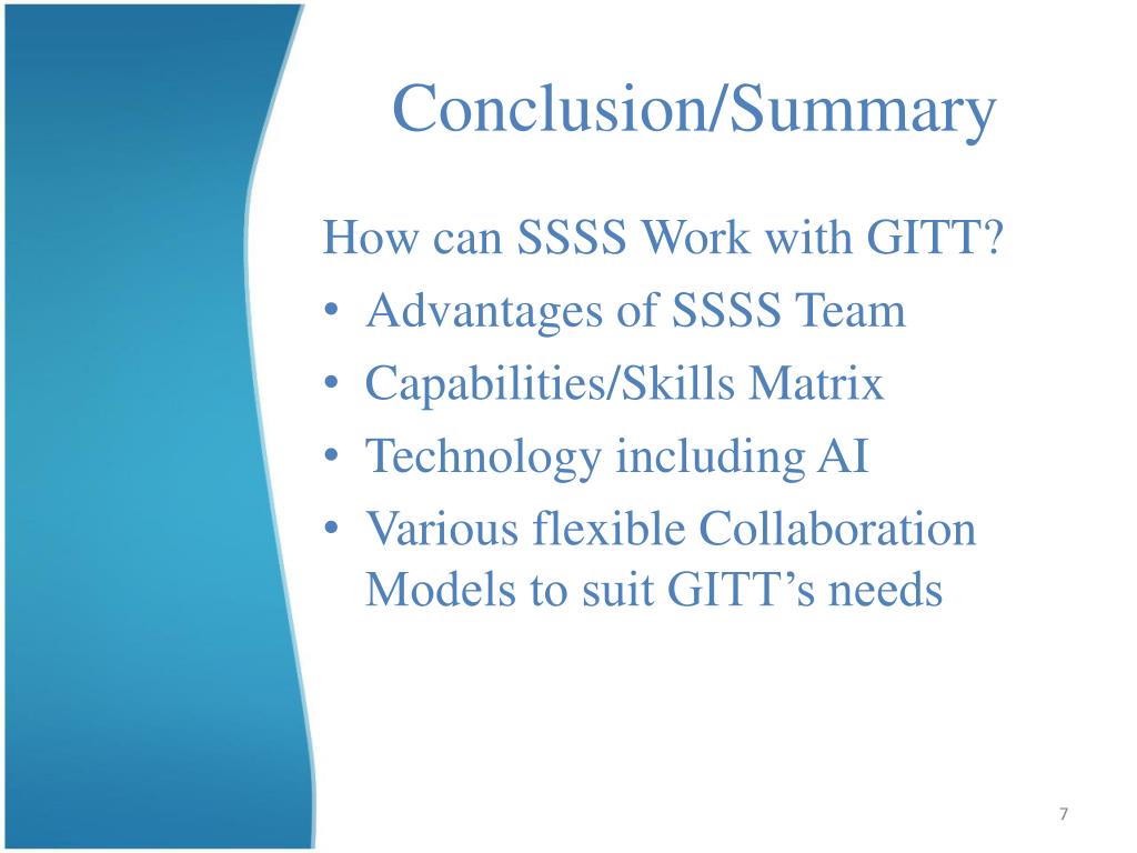 Conclusion/Summary How can SSSS Work with GITT? • Advantages of SSSS Team • Capabilities/Skills Matrix • Technology including AI • Various flexible Collaboration Models to suit GITT’s needs
