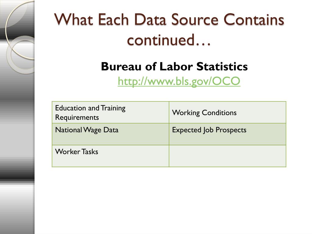What Each Data Source Contains continued… Bureau of Labor Statistics http://www.bls.gov/OCO