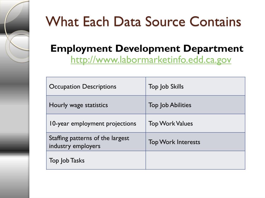 What Each Data Source Contains Employment Development Department http://www.labormarketinfo.edd.ca.gov