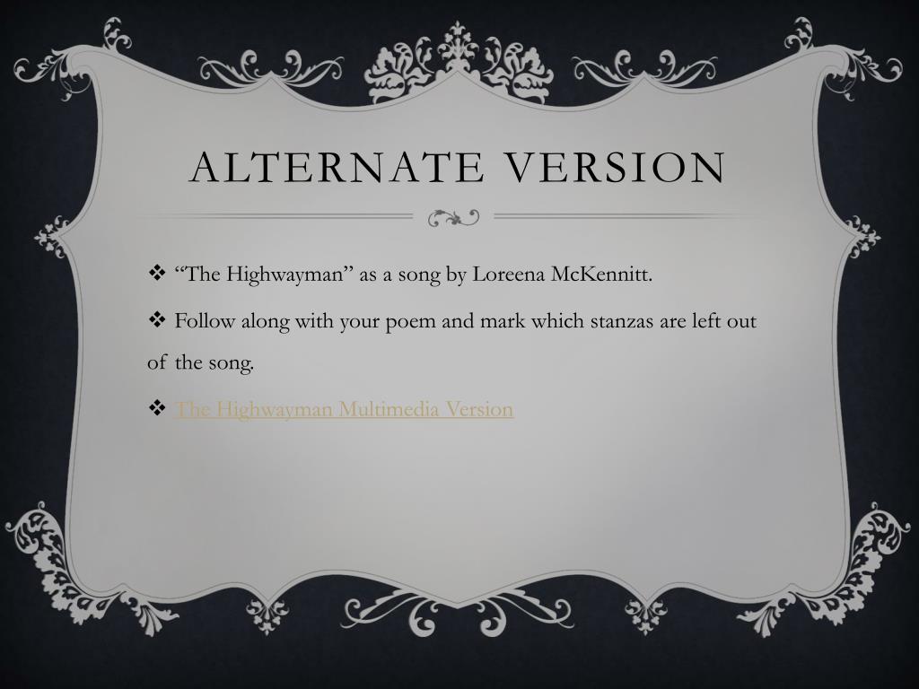 Alternate Version • “The Highwayman” as a song by LoreenaMcKennitt. • Follow along with your poem and mark which stanzas are left out of the song. • The Highwayman Multimedia Version