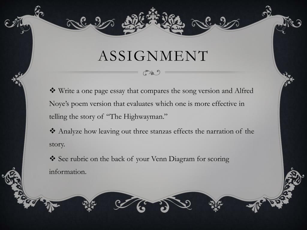Assignment • Write a one page essay that compares the song version and Alfred Noye’spoem version that evaluates which one is more effective in telling the story of “The Highwayman.” • Analyze how leaving out three stanzas effects the narration of the story. • See rubric on the back of your Venn Diagram for scoring information.