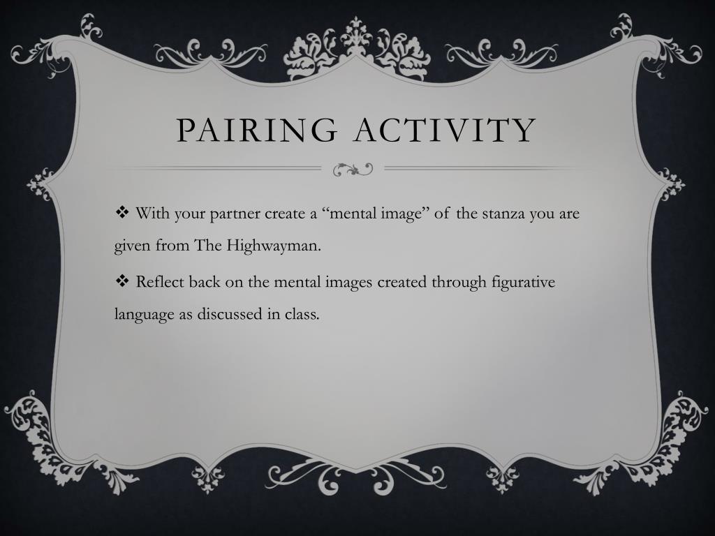 Pairing Activity • With your partner create a “mental image” of the stanza you are given from The Highwayman. • Reflect back on the mental images created through figurative language as discussed in class.