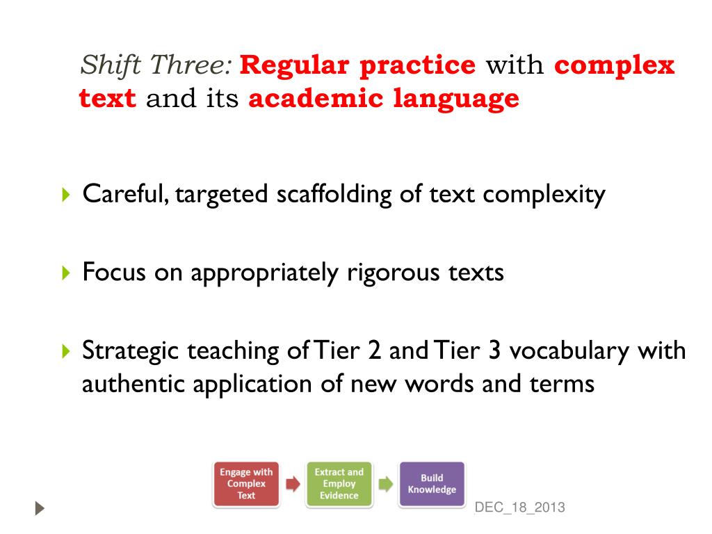 Shift Three: Regular practice withcomplex textand its academic language CCR_CCSS_ELA_DEC_18_2013 Careful, targeted scaffolding of text complexity Focus on appropriately rigorous texts Strategic teaching of Tier 2 and Tier 3 vocabulary with authentic application of new words and terms