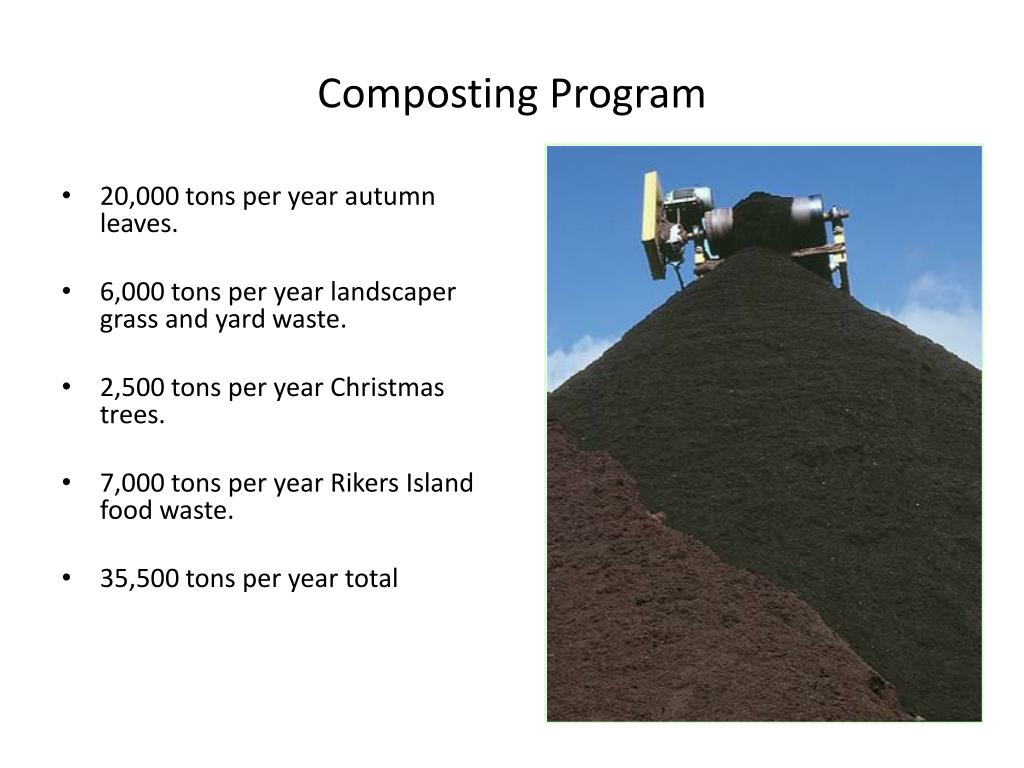 20,000 tons per year autumn leaves. 6,000 tons per year landscaper grass and yard waste. 2,500 tons per year Christmas trees. 7,000 tons per year Rikers Island food waste. 35,500 tons per year total Composting Program