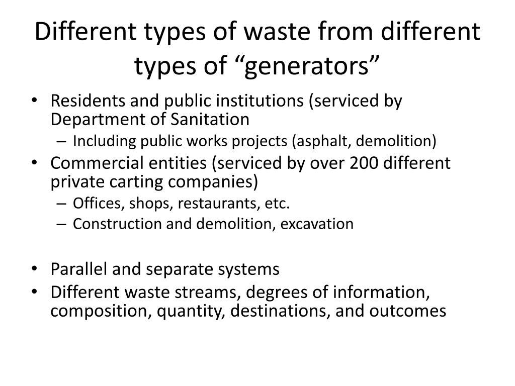 Different types of waste from different types of “generators” • Residents and public institutions (serviced by Department of Sanitation • Including public works projects (asphalt, demolition) • Commercial entities (serviced by over 200 different private carting companies) • Offices, shops, restaurants, etc. • Construction and demolition, excavation • Parallel and separate systems • Different waste streams, degrees of information, composition, quantity, destinations, and outcomes