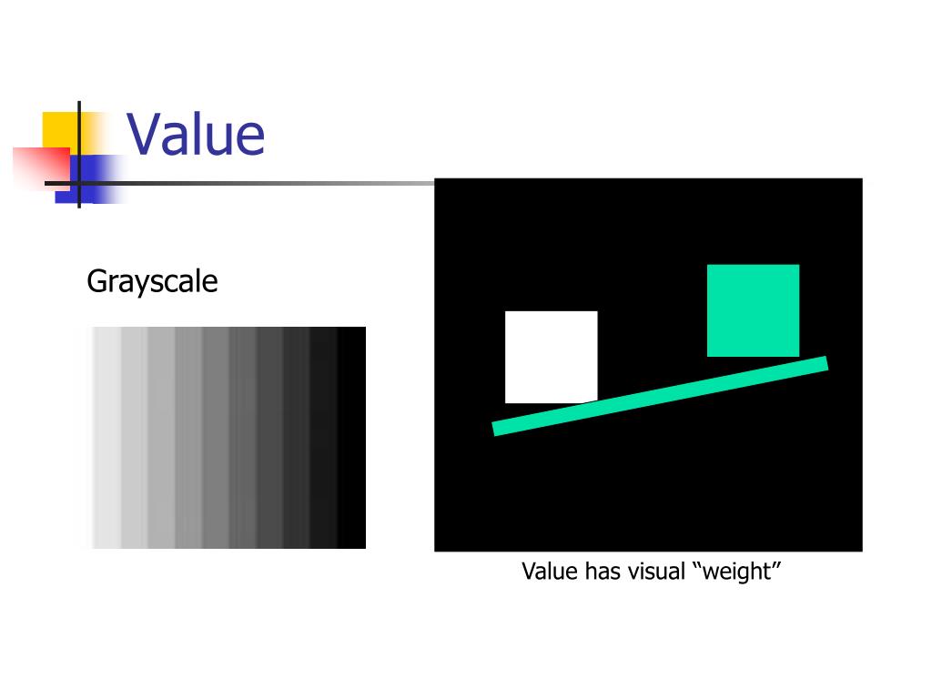 …color • Secondary colors: the result of the addition of two primary colors • Complementary color: The opposite color in the color wheel has the property of balancing the first • Hue: The definition of the color. Example: blue, red, orange. • Value: The scale of darkness • Chroma or tint: The saturation of the color