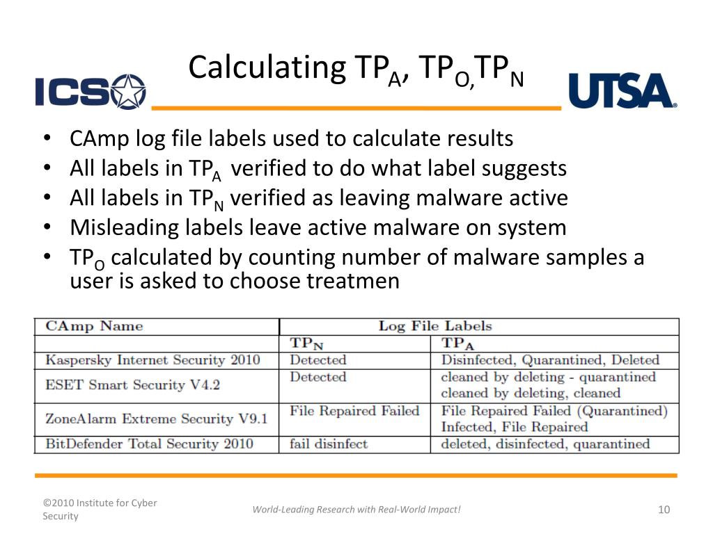 Calculating TPA, TPO,TPN • CAmp log file labels used to calculate results • All labels in TPA verified to do what label suggests • All labels in TPN verified as leaving malware active • Misleading labels leave active malware on system • TPO calculated by counting number of malware samples a user is asked to choose treatmen World-Leading Research with Real-World Impact!