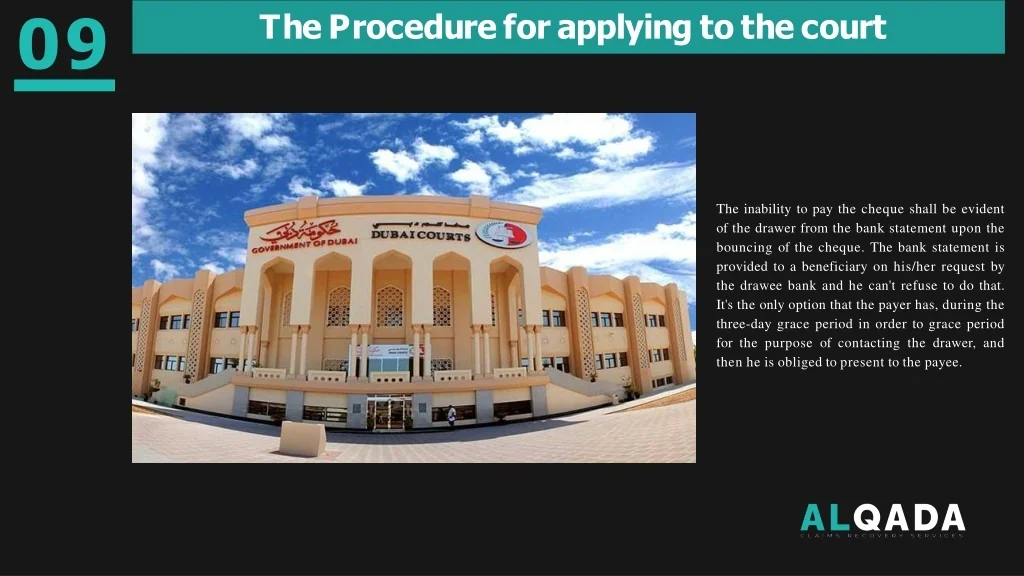 09 TheProcedureforapplyingtothecourt The inability to pay the cheque shall be evident of the drawer from the bank statement upon the bouncing of the cheque. The bank statement is provided to a beneficiary on his/her request by the drawee bank and he can't refuse to do that. It'stheonlyoptionthatthepayerhas,duringthe three-day grace period in order to grace period for the purpose of contacting the drawer, and thenheisobligedtopresenttothepayee.