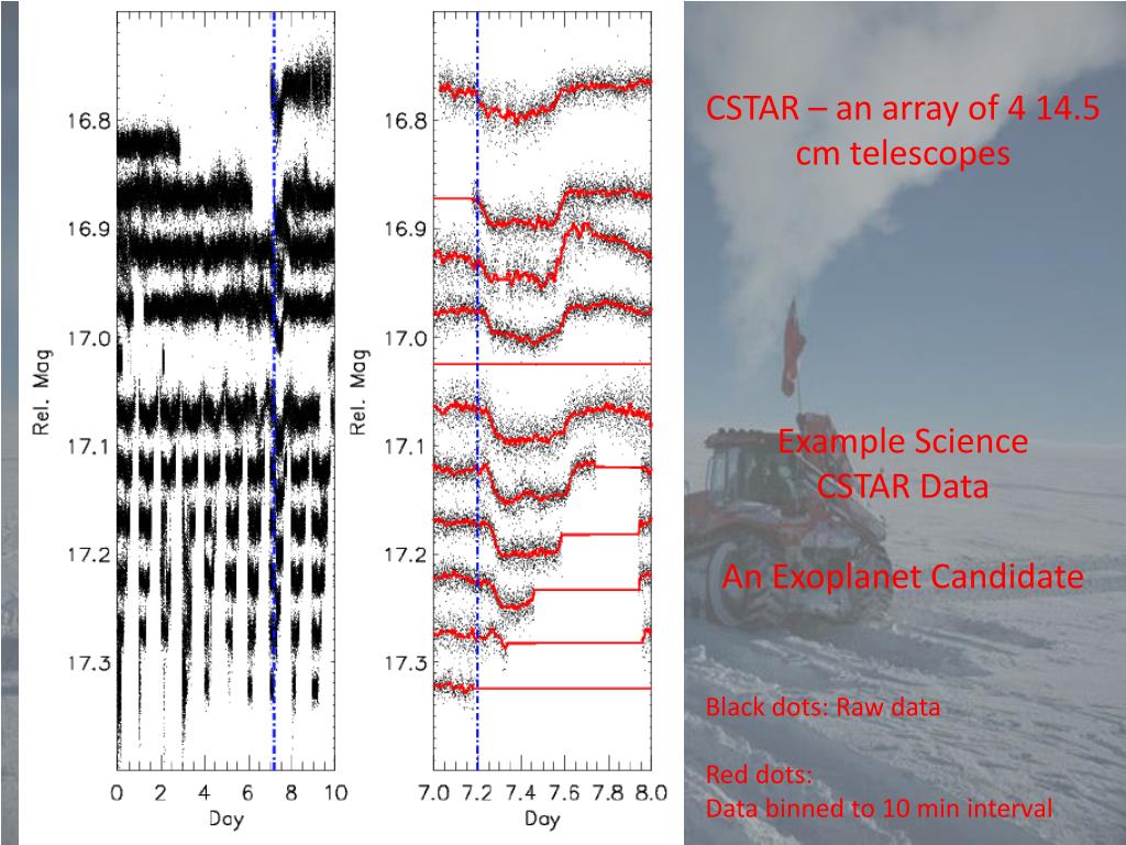CSTAR – an array of 4 14.5 cm telescopes Example ScienceCSTAR DataAn Exoplanet Candidate Black dots: Raw data Red dots: Data binned to 10 min interval